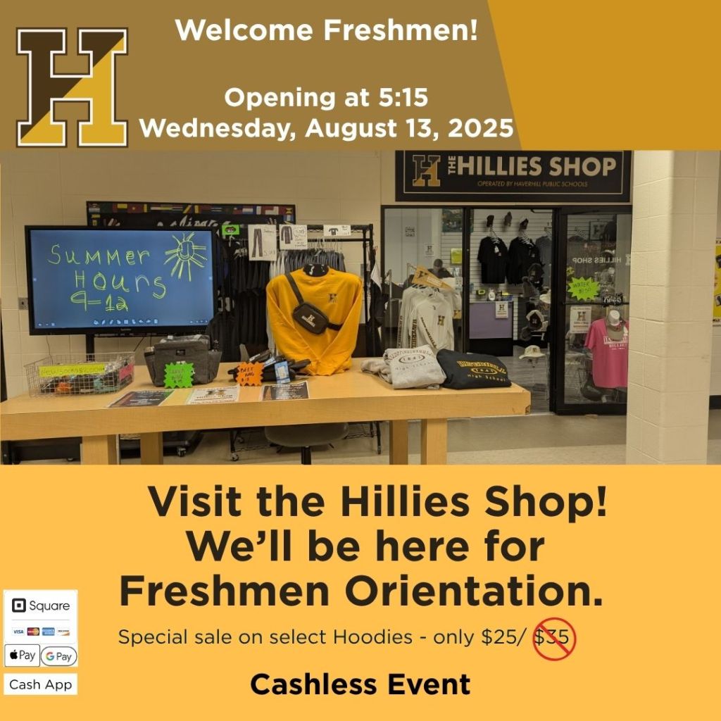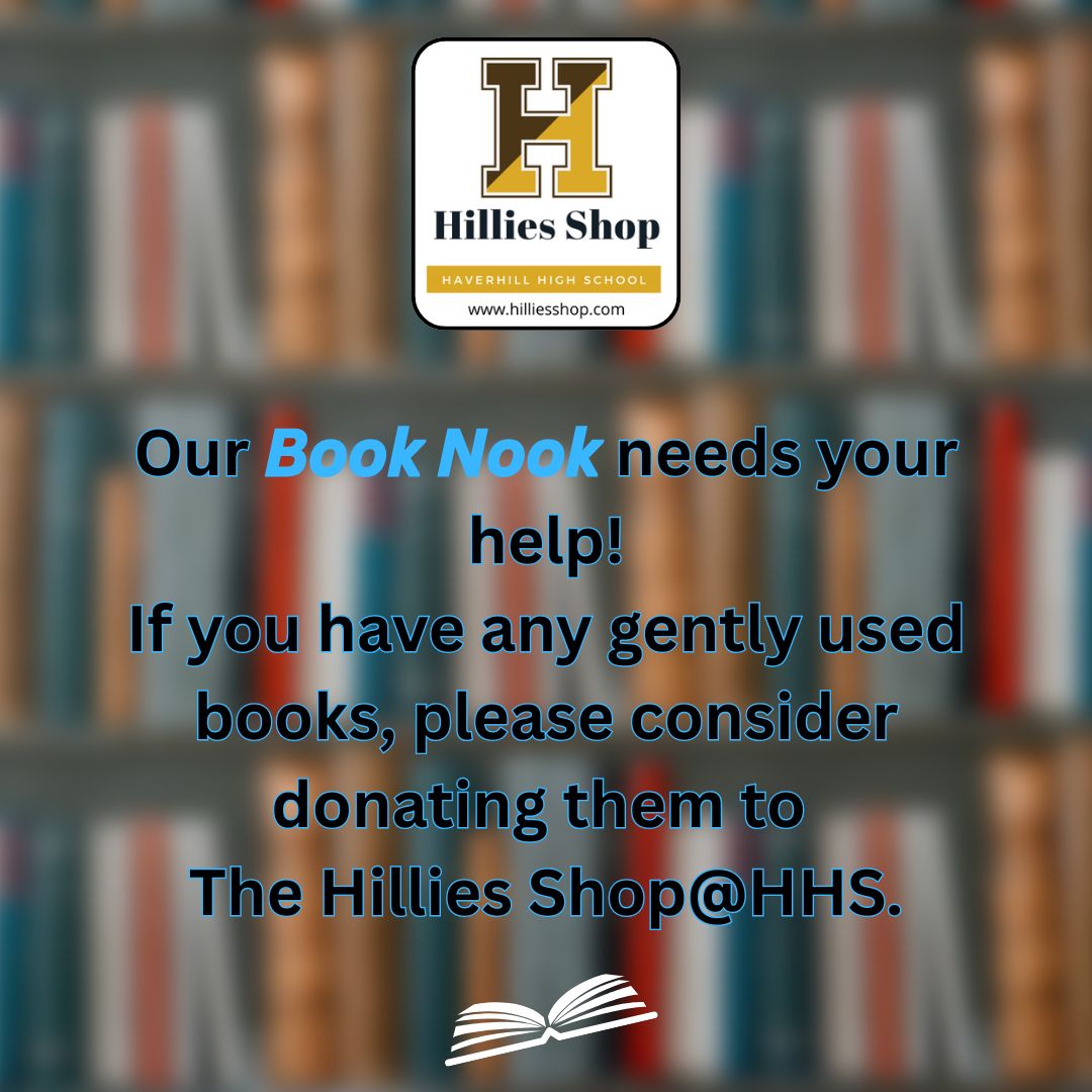 Please consider donating to the Hillies Shop. We are looking for gently used books – any genres. Donations can be left at the HHS Main Office or our City Hall Location. With vacation approaching, our HHS students really appreciate a free book or two to enjoy!
