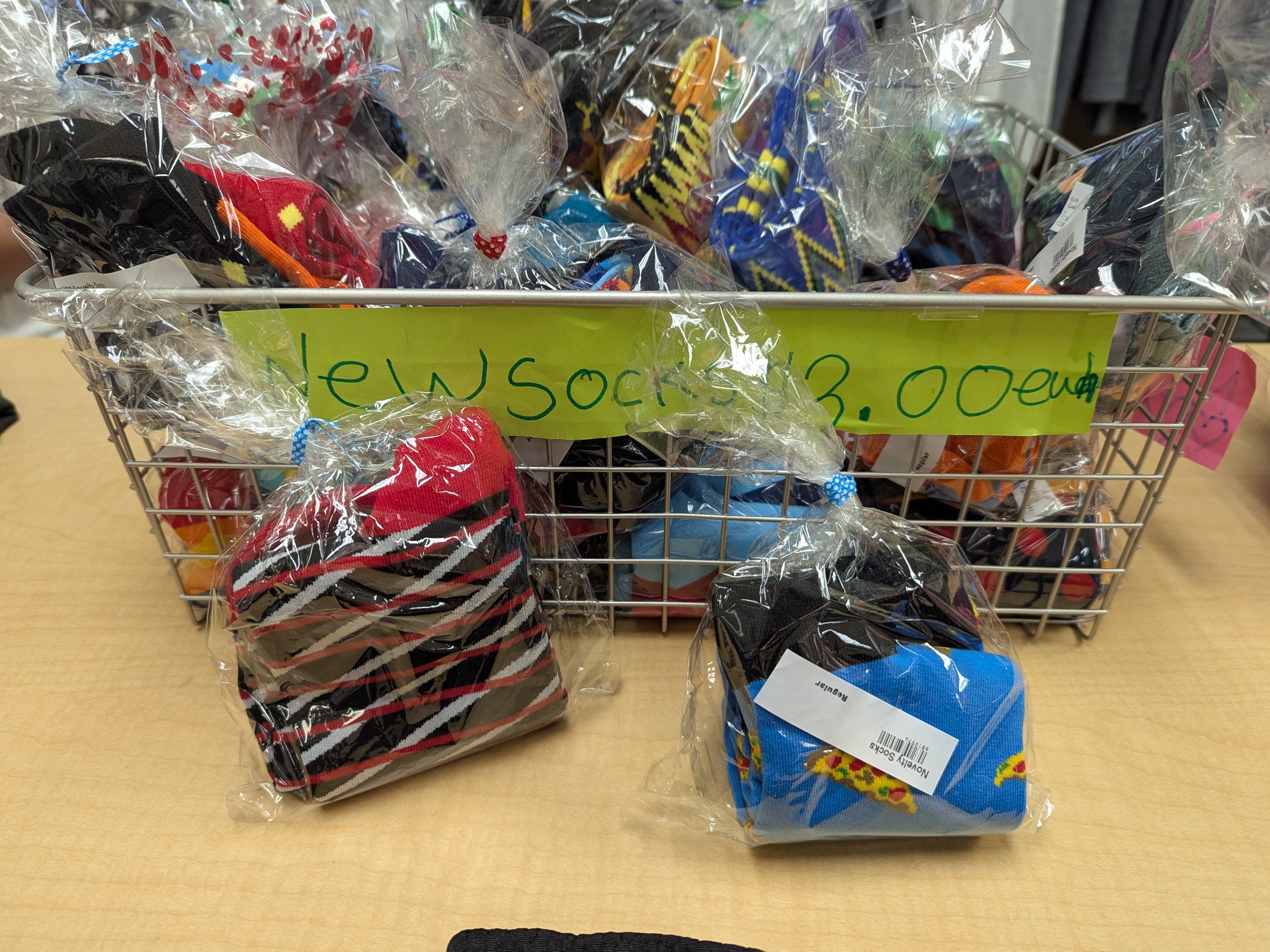 We’re selling bracelets packaged in 3 packs for $2. For only $ .50 you can get a pin. Metal and Acrylic styles available in a variety of designs. Our funky sock collections is an overnight favorite. You’ll find pizza socks, cool geometric designs, polka dots, and so much more! A package of socks is available for $3.00.