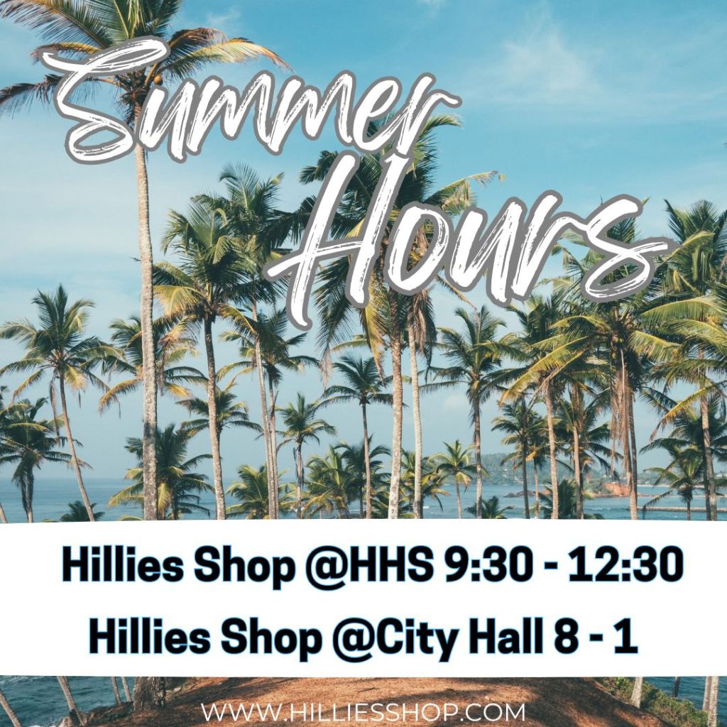 Summer Hours Posted on July 3, 2024July 9, 2024 by hilliesshop The Hillies Shop @HHS is opening onMonday, July 8th! Our City Hall location is open now.We look forward to seeing you!